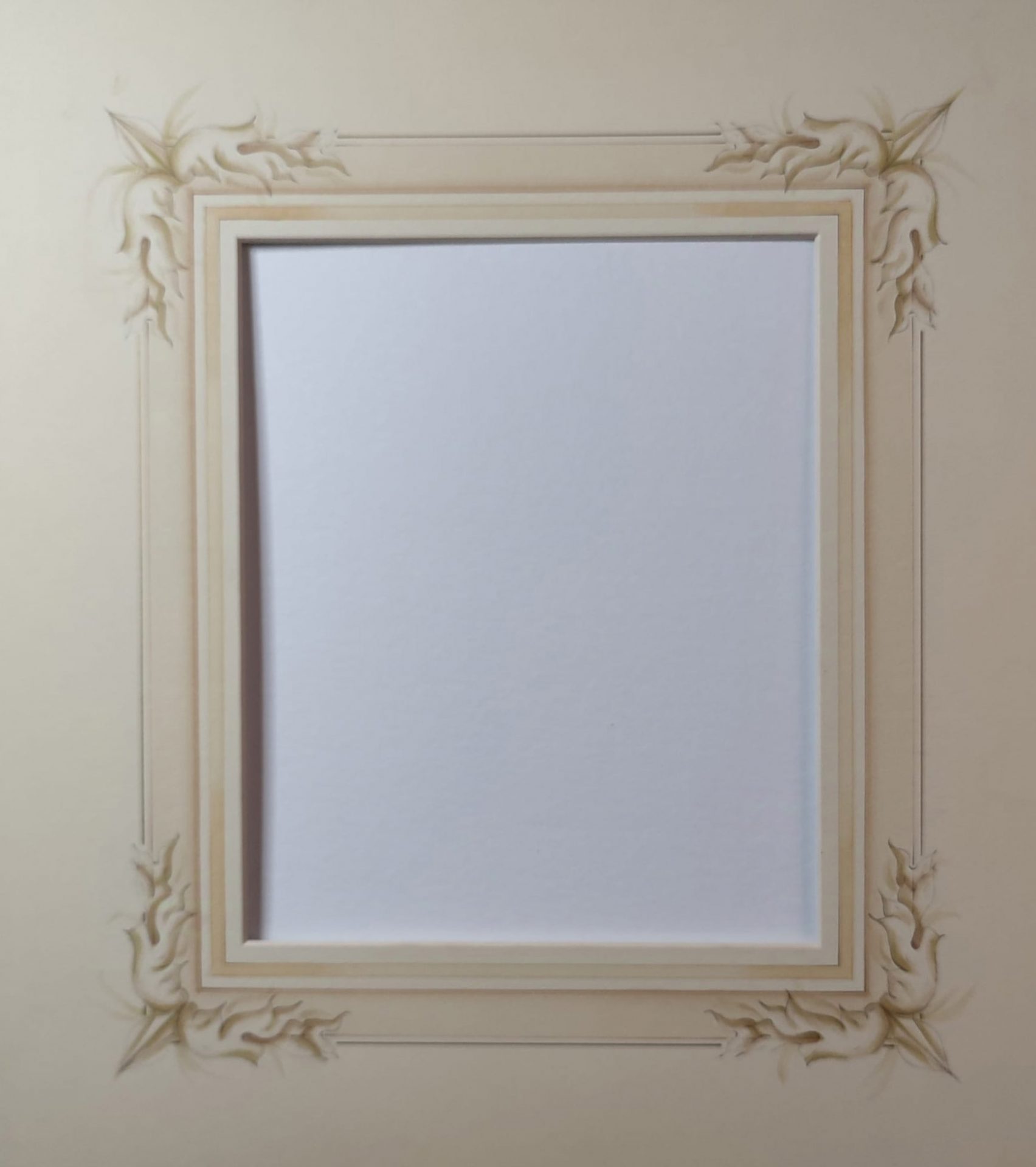 - Passepartout Francés: Este tipo de paspartú se caracteriza por sus detalles decorativos, que suelen incluir líneas acuareladas a mano. Es ideal para obras que requieren un toque de elegancia y sofisticación, ya que añade un componente visual adicional que complementa la obra sin distraer de ella.